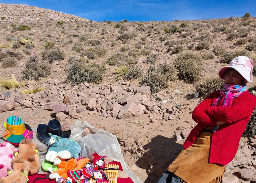 Sobre una manta ofrecía sus artesanías, hojas de coca y yuyos —como la papusa—, aliados para combatir el soroche, el mal de altura que ataca con mareos y dolor de cabeza a quienes no están habituados a estas alturas.